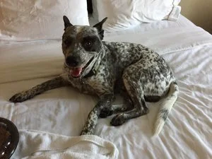 I love eating in hotel beds, playing tug, especially with my orange Chuck-It ball, and telling Dad what to do. I go everywhere with him, and it's pretty great. I know I'm special.
